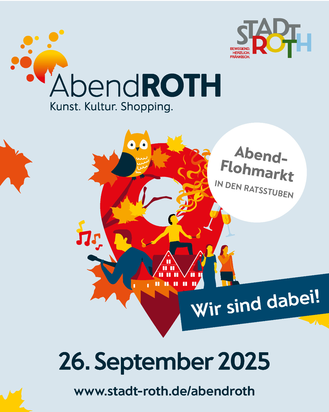Am Donnerstag, den 26. September, heißt es wieder AbendRoth: Die Innenstadt von Roth verwandelt sich in eine stimmungsvolle Flaniermeile mit Musik, Genuss und besonderen Aktionen. Auch wir sind